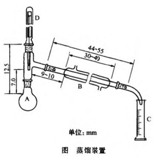 仪器装置如图。用国产19标准磨口蒸馏装置一套。A为蒸馏瓶;B为冷凝管,馏程在130℃以下用水冷却,馏程在130℃以上用空气冷凝管;C为具有0.5ml刻度的25ml量筒;D为分浸型具有0.5℃刻度的温度计,预先经过校正,温度计汞球的上端与蒸馏瓶出口支管的下壁相齐;根据供试品馏程的不同,可选用不同的加热器,通常馏程在80℃以下时用水浴(其液面始终不得超过供试品液面),80℃以上时用直接火焰或其他电热器加热。